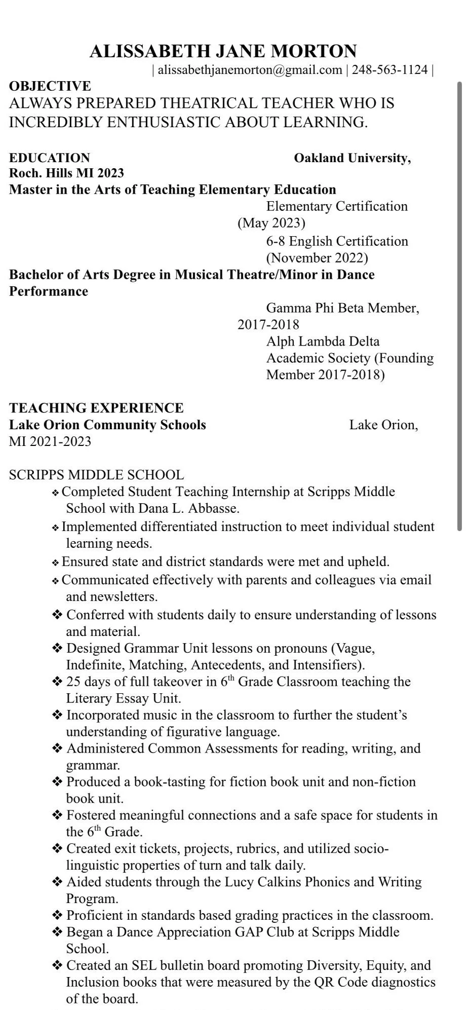 I worked for a high GPA of 3.9 in my graduate studies, whilst balancing three jobs: a substitute teacher, a dance teacher, and full-time student. I won the “Why I Substitute Teach” award through EduStaff in 2022. I was also a recipient of the Alumnae Association Scholarship from Oakland University for 2022-2023. In addition to that, I was nominated to receive the Student Teaching Award of 2022-2023 through the university. This was a highly distinguished award, and was awarded to one Elementary Education Student in the program at OU. Besides my awards , the greatest achievement is seeing all of my student’s faces light up when they finally understand a standard they have been struggling with.